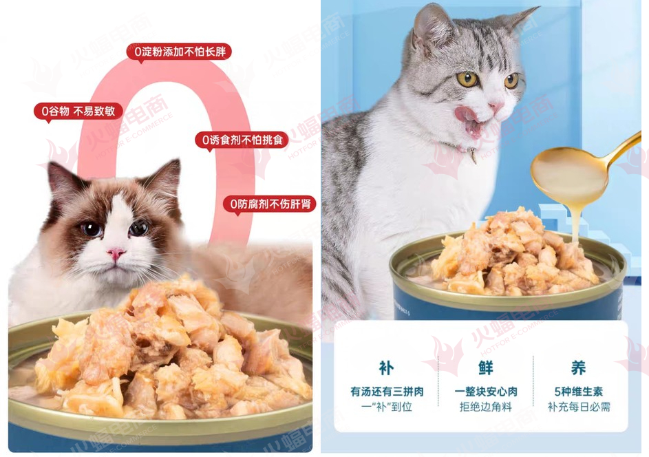 團隊結合市場,錨定品牌方初期的核心目標受眾為90后年輕新養寵人群。在視覺上,不過度追求精美的效果圖,走差異化路線,以更落地的方式呈現每一款產品。用「勺子」「汁水」以及貓咪「舔舌」的本能反應等一系列元素,將天然、新鮮的品牌印象直觀地傳達給消費者;在產品上,以「0防腐劑」「0淀粉」展現天然原材,以添加「牛磺酸」「葉酸」「益生元」凸顯營養豐富,以「專家團隊」「資質認證」作為信任背書。如此通過產品+視覺雙驅動,來鞏固「懂貓愛貓」的輕奢貓品牌的形象定位,滿足寵物主精細化喂養需求。在雙方配合下,截至發稿日,該寵物品牌天貓旗艦店粉絲已突破24萬。